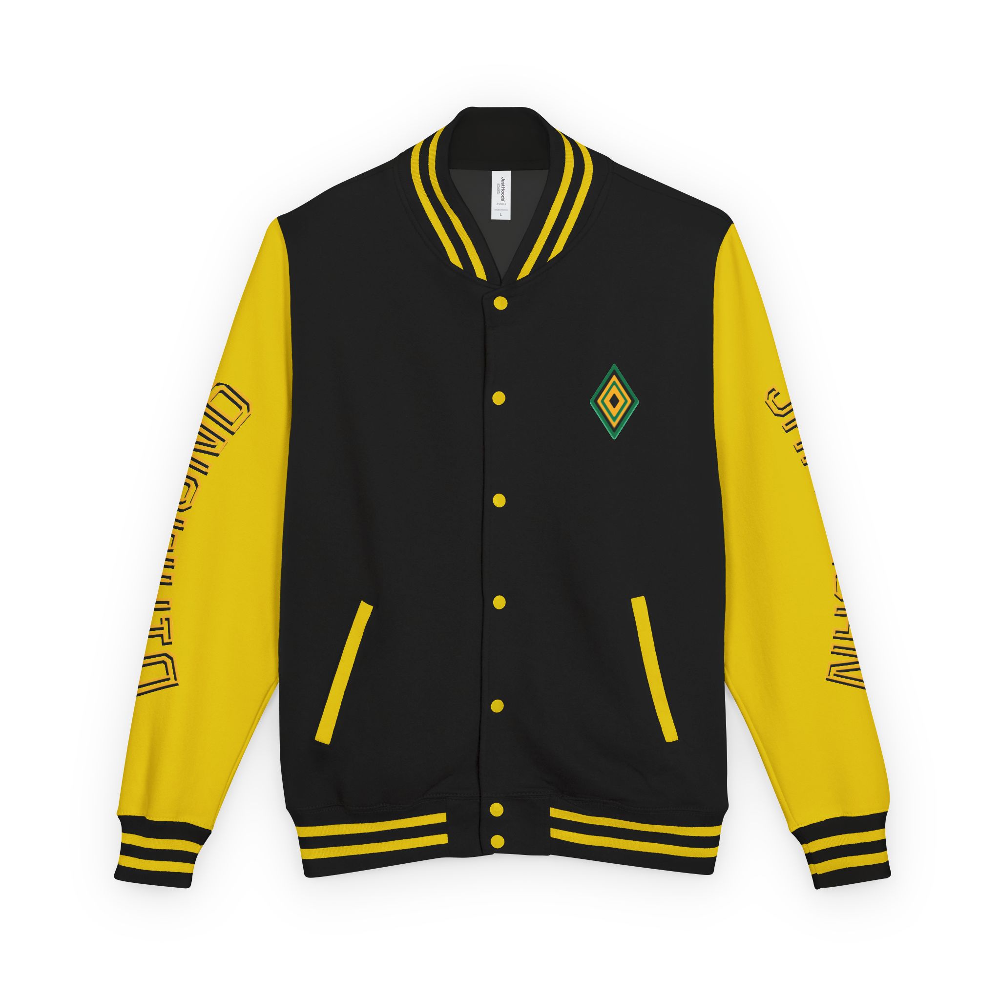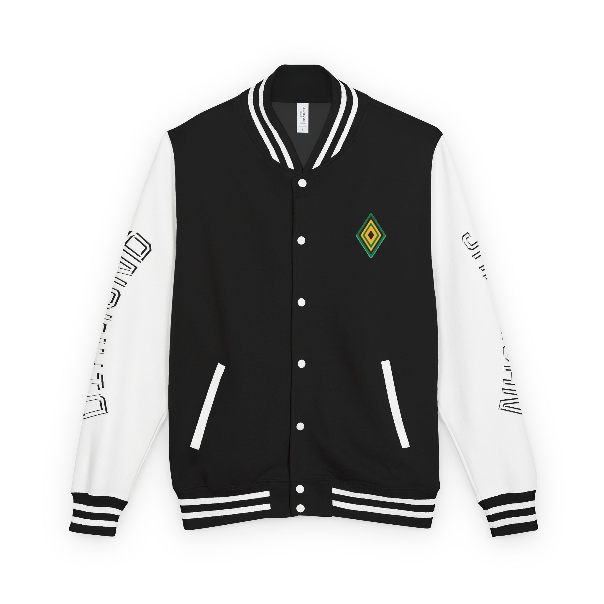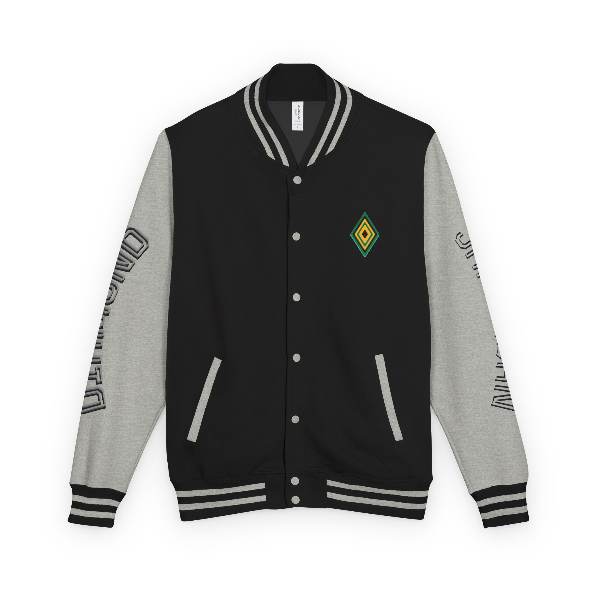 – Classic varsity details: contrasting sleeves, snap front, striped ribbed cuffs and hem