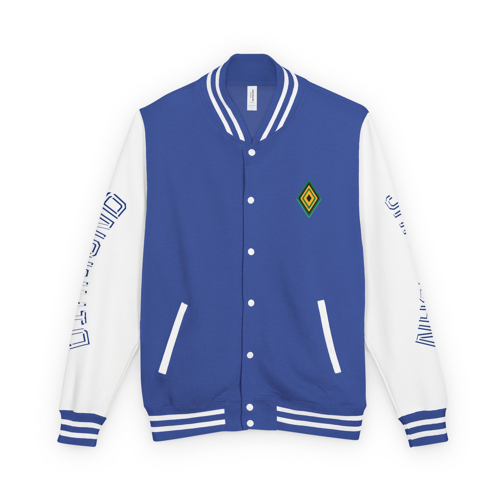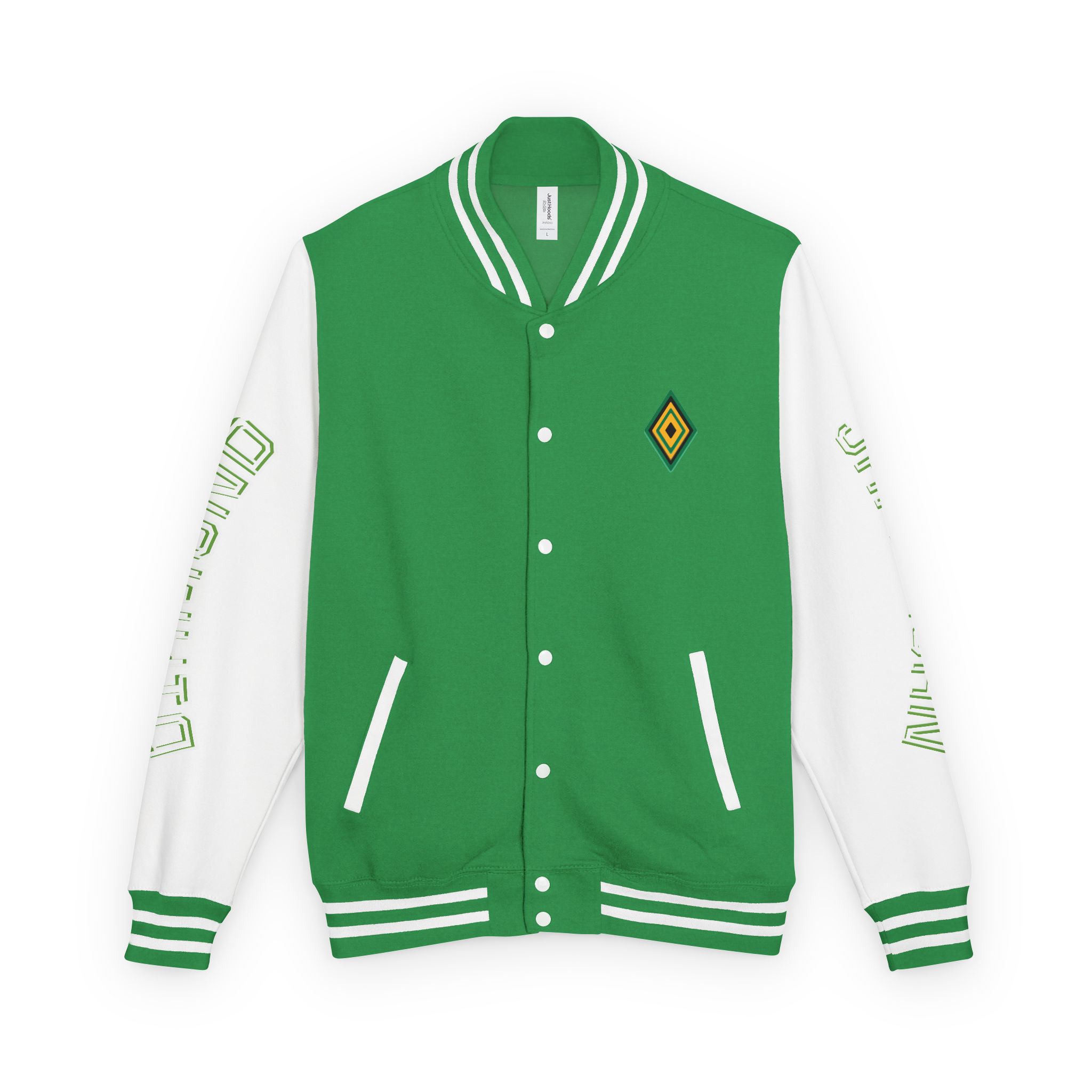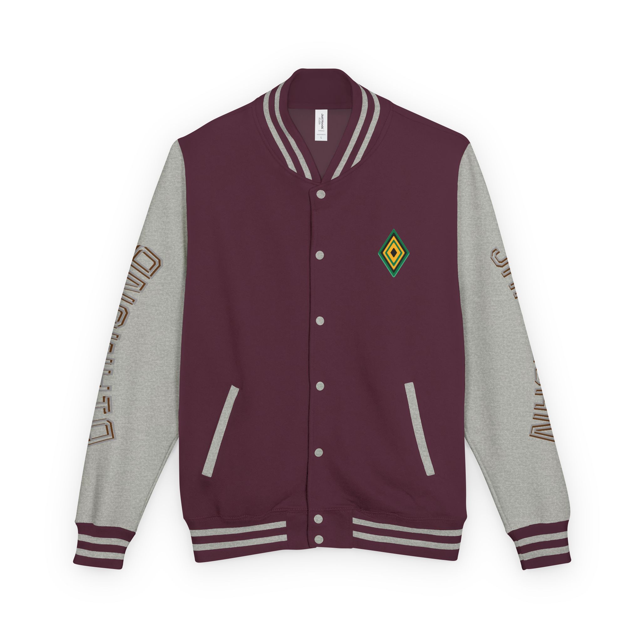– Classic varsity details: contrasting sleeves, snap front, striped ribbed cuffs and hem